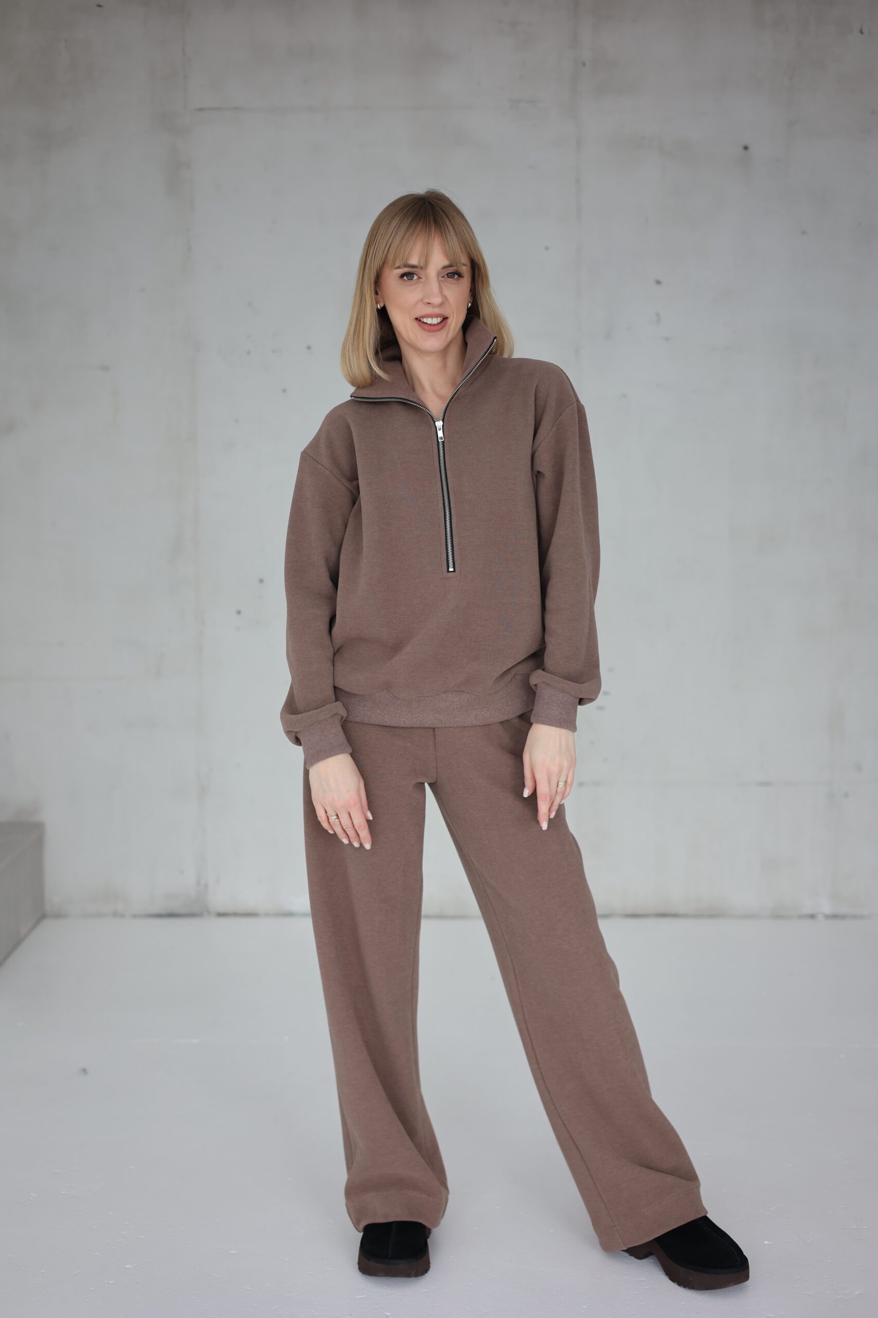 Pirkau komplektą su kelnėm ir pagal individualius išmatavimus užsakiau. Buvo truputį neramu,kad gal blogai išsimatavau,bet gavus rūbą,jis idealiai tiko. Ir kelnių ilgis,ir megztukas,na tiesiog tobulai atrodo. Ir be galo patogus. Megztuko modelis su užtrauktuku man ypač patinka