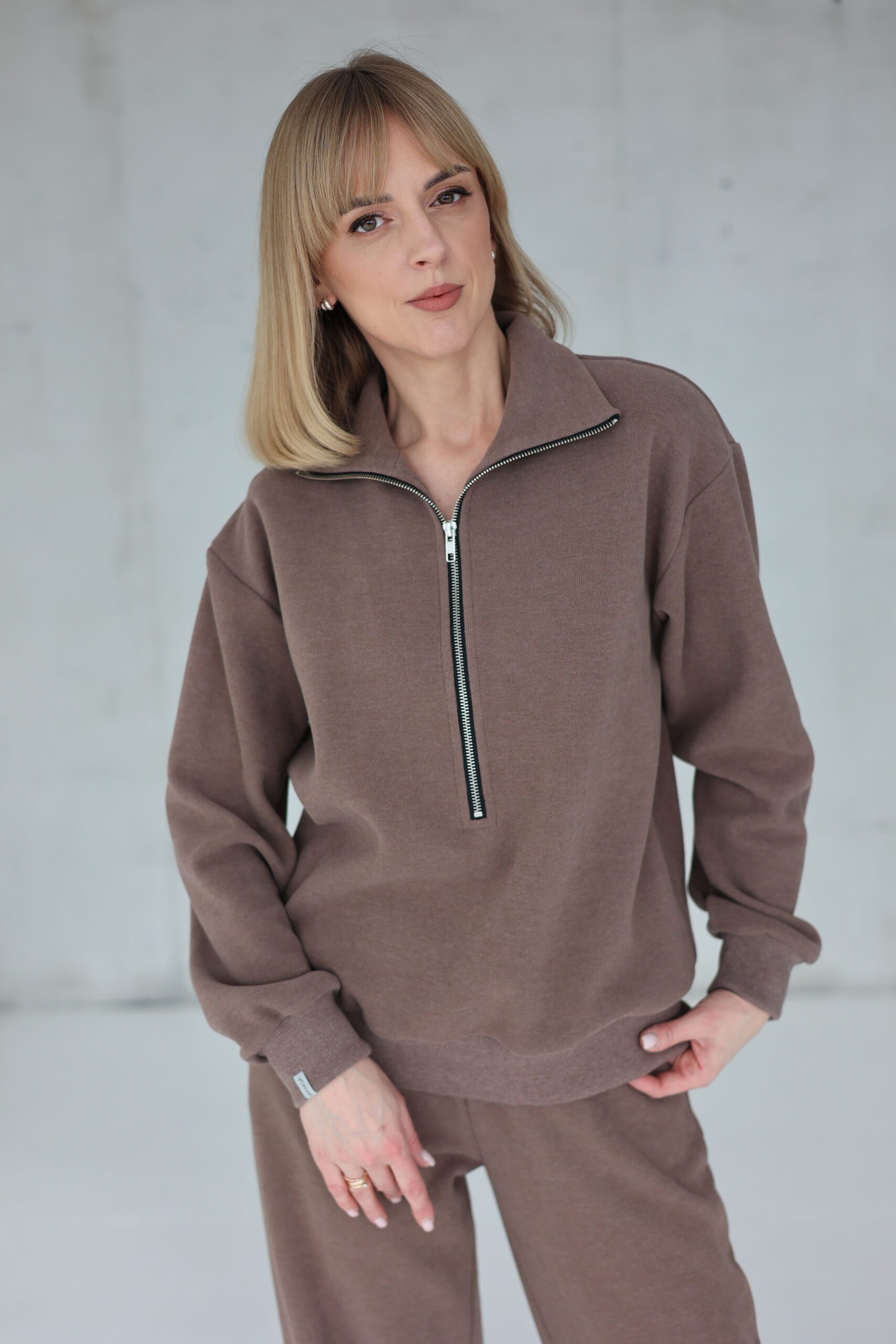 Džemperis su užtrauktuku – patogus ir stilingas pasirinkimas kiekvienai dienai. Minkštas persikinio efekto trikotažas ne tik malonus odai, bet ir suteikia įvaizdžiui daugiau elegancijos. Užtrauktuką galite pilnai užsegti (labai patogu taip dėvėti po paltu) arba prasegti. Aukštesnė apykaklė, užsegus, apsaugo nuo vėjo, o laisvas siluetas leidžia jaustis patogiai visą dieną.